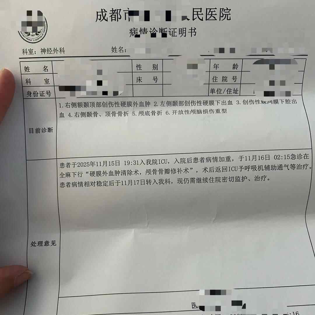 回忆起11月15日晚的情景,程女士仍心有余悸。她哽咽地描述,妹妹被诊断为颅内出血,立即进行了开颅手术,手术过程顺利,目前恢复良好,但医生警告不排除二次出血的风险,需密切观察,“后面我也是看了网上的视频,才知道这件事是如何发生的。”