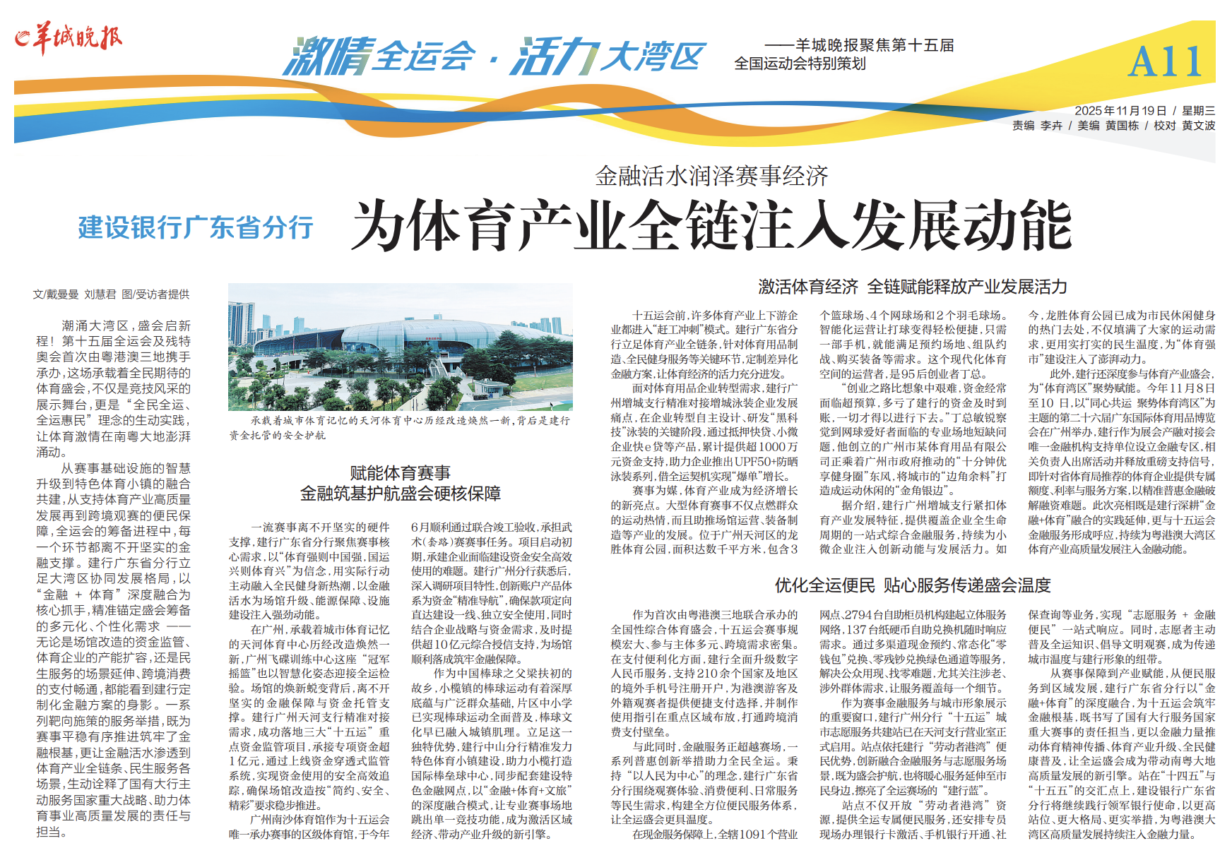 从赛事保障到产业赋能,从便民服务到区域发展,建行广东省分行以“金融+体育”的深度融合,为十五运会筑牢金融根基,既书写了国有大行服务国家重大赛事的责任担当,更以金融力量推动体育精神传播、体育产业升级、全民健康普及,让全运盛会成为带动南粤大地高质量发展的新引擎。站在“十四五”与“十五五”的交汇点上,建设银行广东省分行将继续践行领军银行使命,以更高站位、更大格局、更实举措,为粤港澳大湾区高质量发展持续注入金融力量。