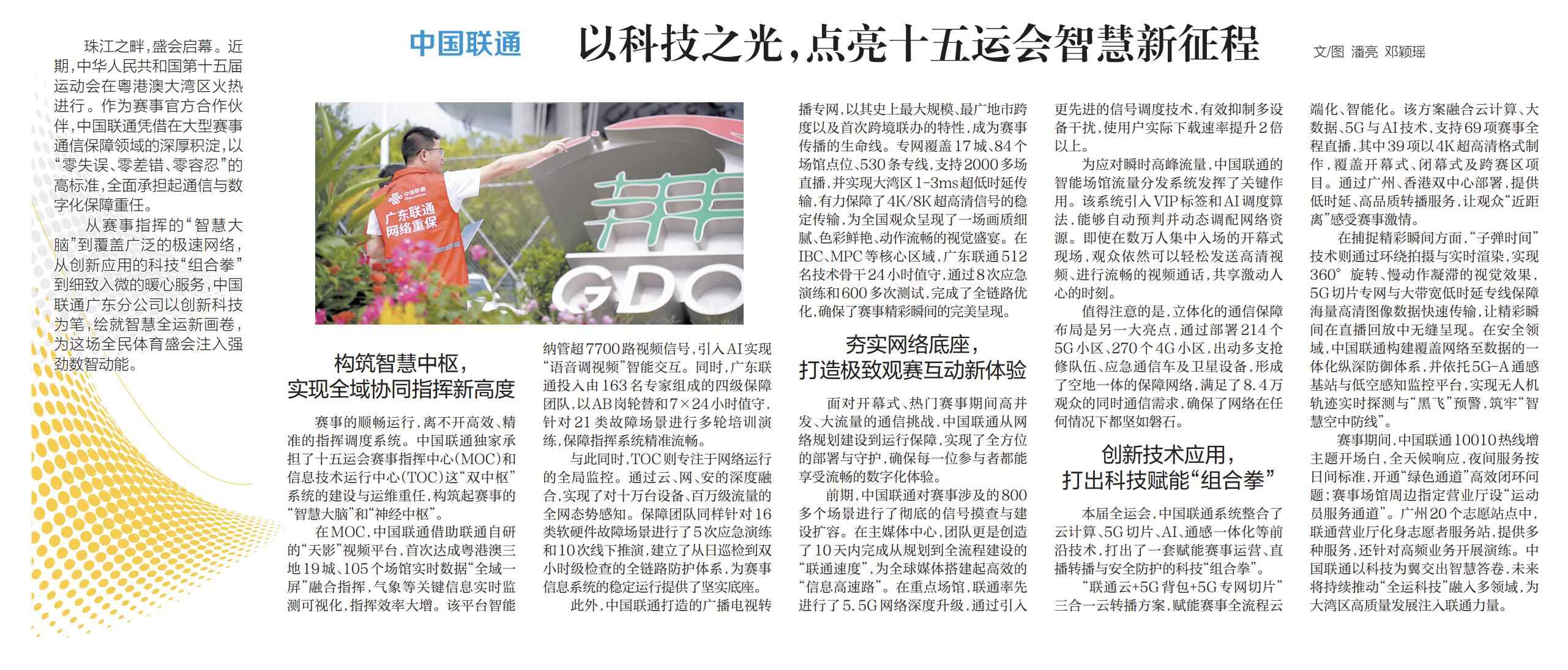 珠江之畔,盛会启幕。近期,中华人民共和国第十五届运动会在粤港澳大湾区火热进行。作为赛事官方合作伙伴,中国联通凭借在大型赛事通信保障领域的深厚积淀,以“零失误、零差错、零容忍”的高标准,全面承担起通信与数字化保障重任。