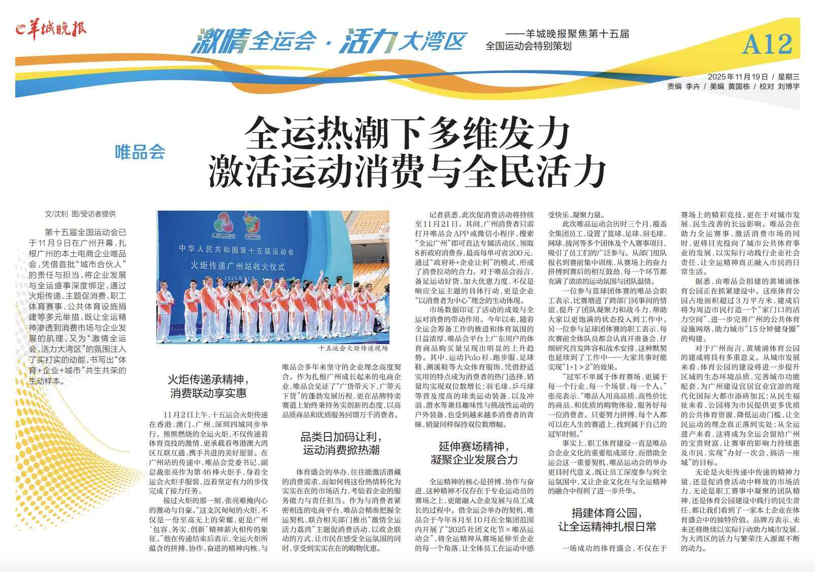第十五届全国运动会已于11月9日在广州开幕,扎根广州的本土电商企业唯品会,凭借首批“城市合伙人”的责任与担当,将企业发展与全运盛事深度绑定,通过火炬传递、主题促消费、职工体育赛事、公共体育设施捐建等多元举措,既让全运精神渗透到消费市场与企业发展的肌理,又为“激情全运会,活力大湾区”的氛围注入了实打实的动能,书写出“体育+企业+城市”共生共荣的生动样本。