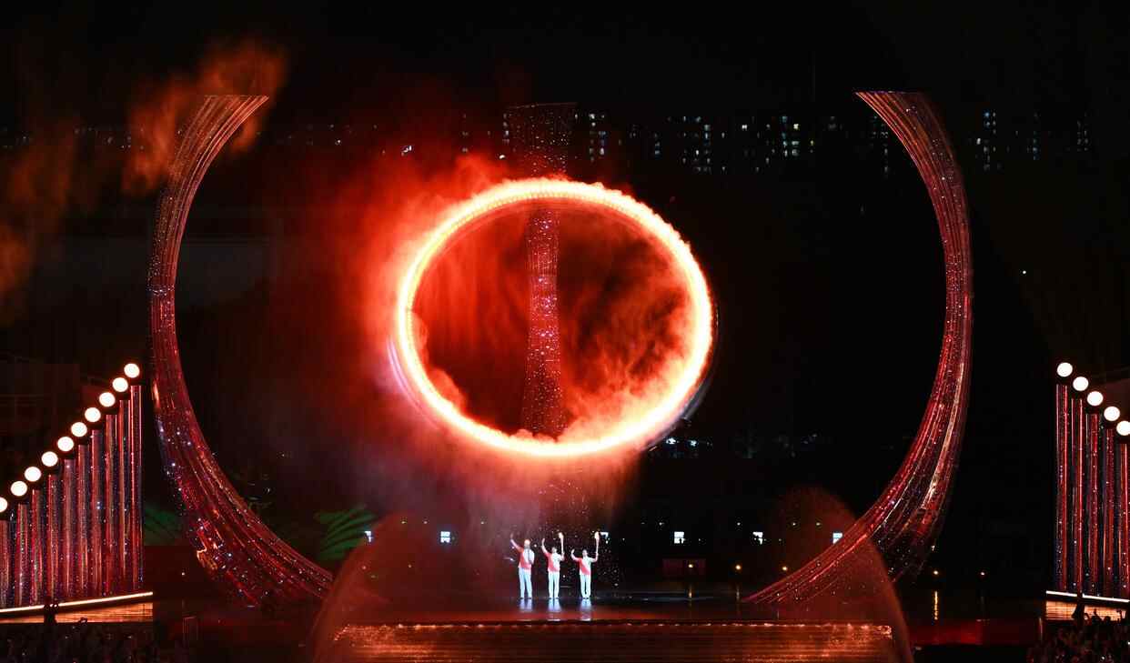 号子声响,鼓声雷动。十五运会开幕式水舞台化身龙舟竞渡场,一艘艘光影龙舟铺在水面,演员以旗为桨,奋力划动,一场龙舟赛就此上演。