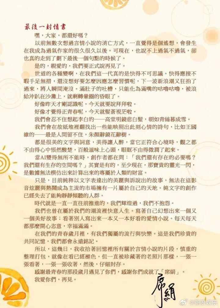 11月19日,中国台湾言情小说作家席绢通过其个人社交媒体发表长文《最后一封情书》正式宣布封笔,结束其长达三十余年的创作生涯。