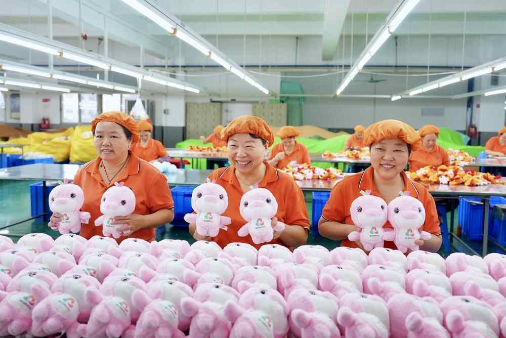 在东莞的文博工艺品有限公司生产车间里,流水线高速运转,工人加班加点赶工,一箱箱封装完毕的吉祥物周边正排队上货柜。
