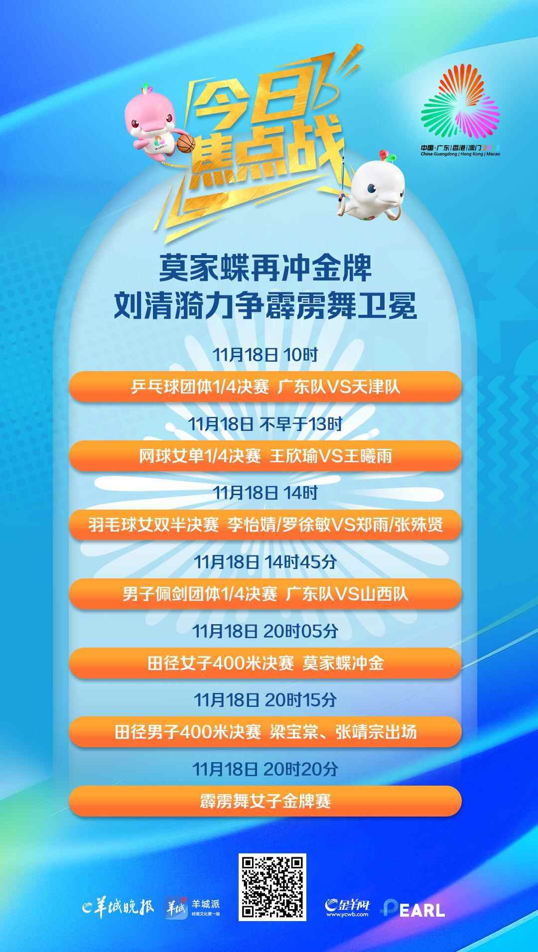 11月18日,十五运会正赛迎来第九个比赛日,田径、举重、霹雳舞等项目将产生18枚金牌,乒乓球团体赛事和羽毛球单项赛事进入关键阶段。