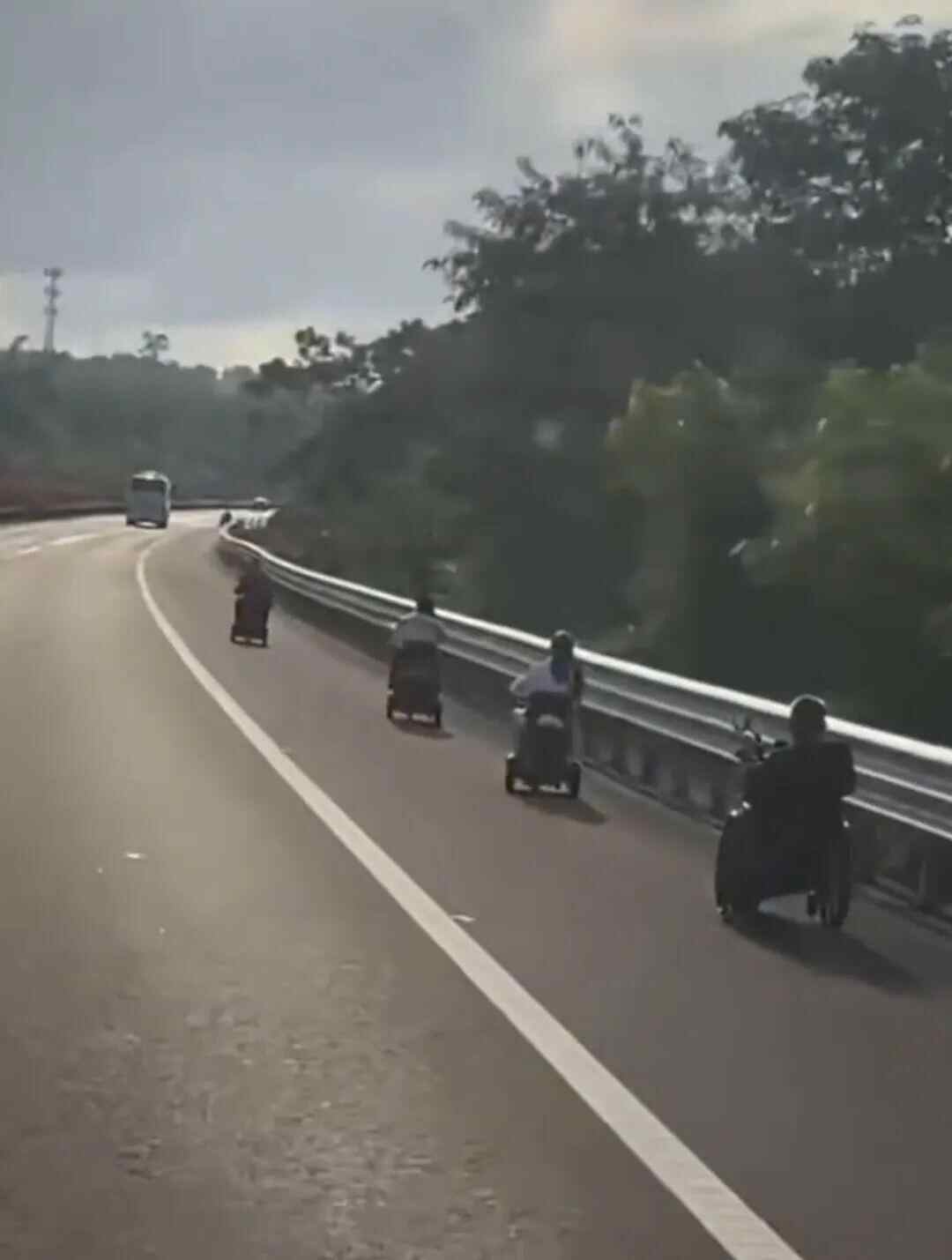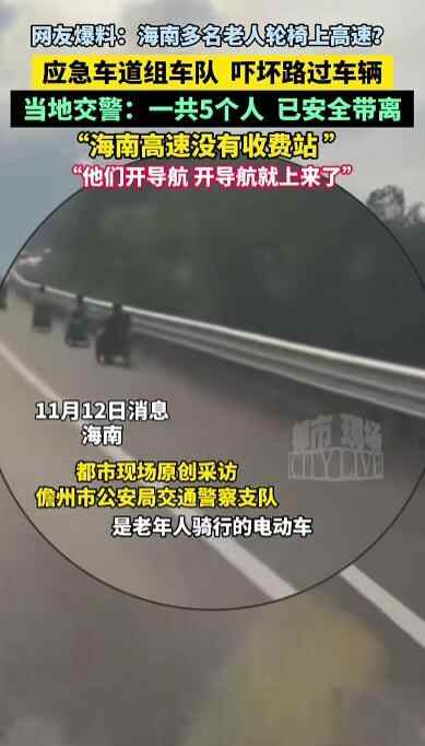 11月12日,网友发布视频称,海南儋州万洋高速上,有多名老人疑似组队开电动轮椅,行驶在应急车道,引发路过车辆担忧。