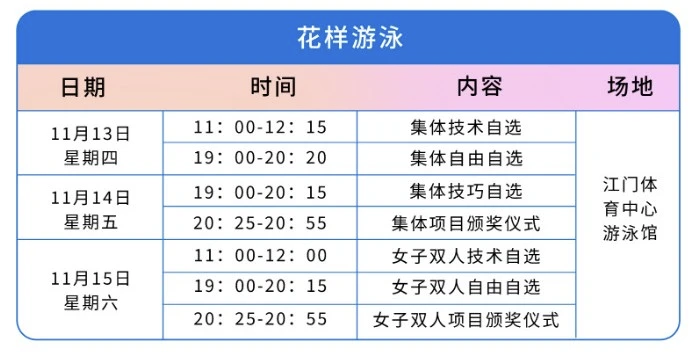 据悉,11月13日19时、11月14日19时、11月15日11时和19时将陆续有花样游泳比赛在江门体育中心游泳馆举行。万众期待的巴黎奥运会冠军王柳懿、王芊懿姐妹将在15日的比赛中亮相。