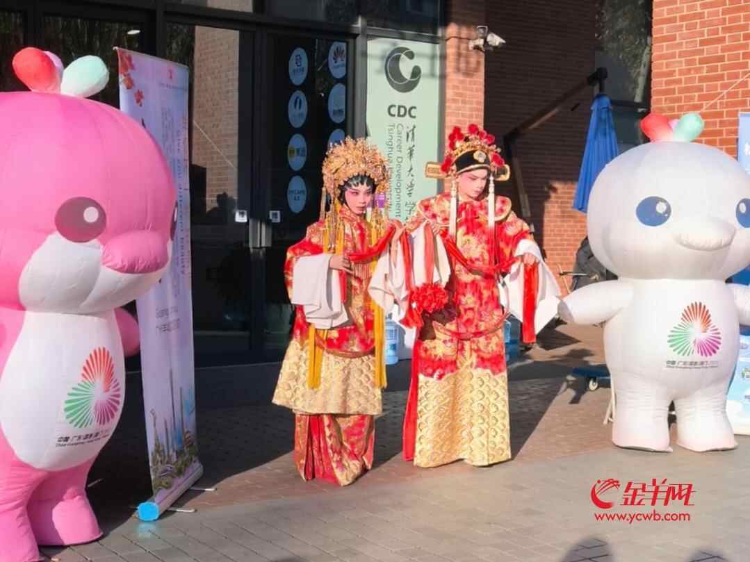 地方特色推介展区里,岭南文化气息扑面而来,热闹非凡又韵味十足。“三雕一彩一绣”的精美工艺品整齐陈列,将岭南工艺的精湛技艺展现得淋漓尽致。来自中国戏曲学院的广东籍学生吴泽铭和黄栩彦现场带来了粤剧经典选段《帝女花》。