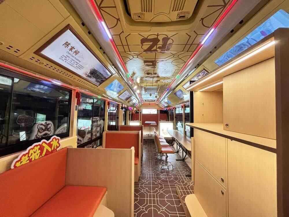 当天,“铛铛巴士”首次亮相。“铛铛巴士”在设计上深度融合岭南文化元素,融汇骑楼轮廓、醒狮与粤剧人物图案;在车厢的内部更是富含巧思,进行精心布置,为乘客营造沉浸式文化体验场景,从车厢的地板、车身内的广彩瓷画到展示陈列柜,每一处细节都彰显了独特的羊城韵味。在车厢内还配备了专业的音响系统,使播放的音乐饱满而富有层次,营造出浓郁的广府文化氛围。