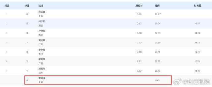 11月13日,全运会男子50米蛙泳决赛发生戏剧性一幕,奥运冠军覃海洋因犯规被取消成绩,他的上海队队友郑英昊以26.97的成绩摘得金牌。湖北队的闫子贝和孙佳俊分获第二第三名。