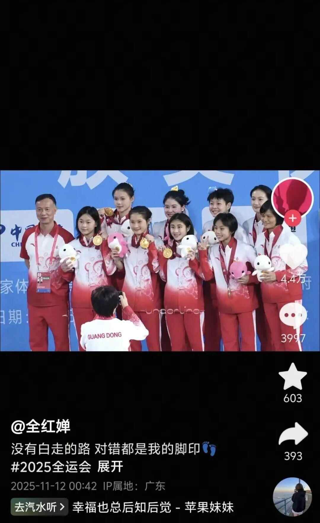 11月12日凌晨,全红婵在社媒上晒出多张全运会现场图,其中包括她和队友合影、颁奖仪式,以及大量全运会个人花絮内容。