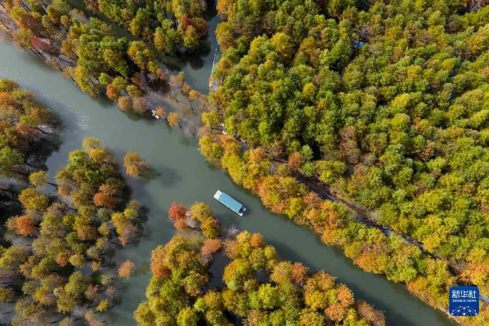 11月11日,在安徽省宣城市宁国市方塘乡,游客乘坐游船观赏红杉林(无人机照片)。