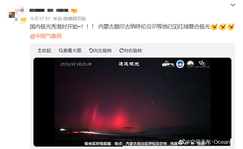 11月异常活跃的太阳黑子群AR4274,已经连爆4个X级大耀斑。国家空间天气监测预警中心11月11日预警:11-12日可能出现中等到大地磁暴,13日可能出现小地磁暴。这意味着只要天气条件允许,我国北方不少地区都有机会拍到极光。