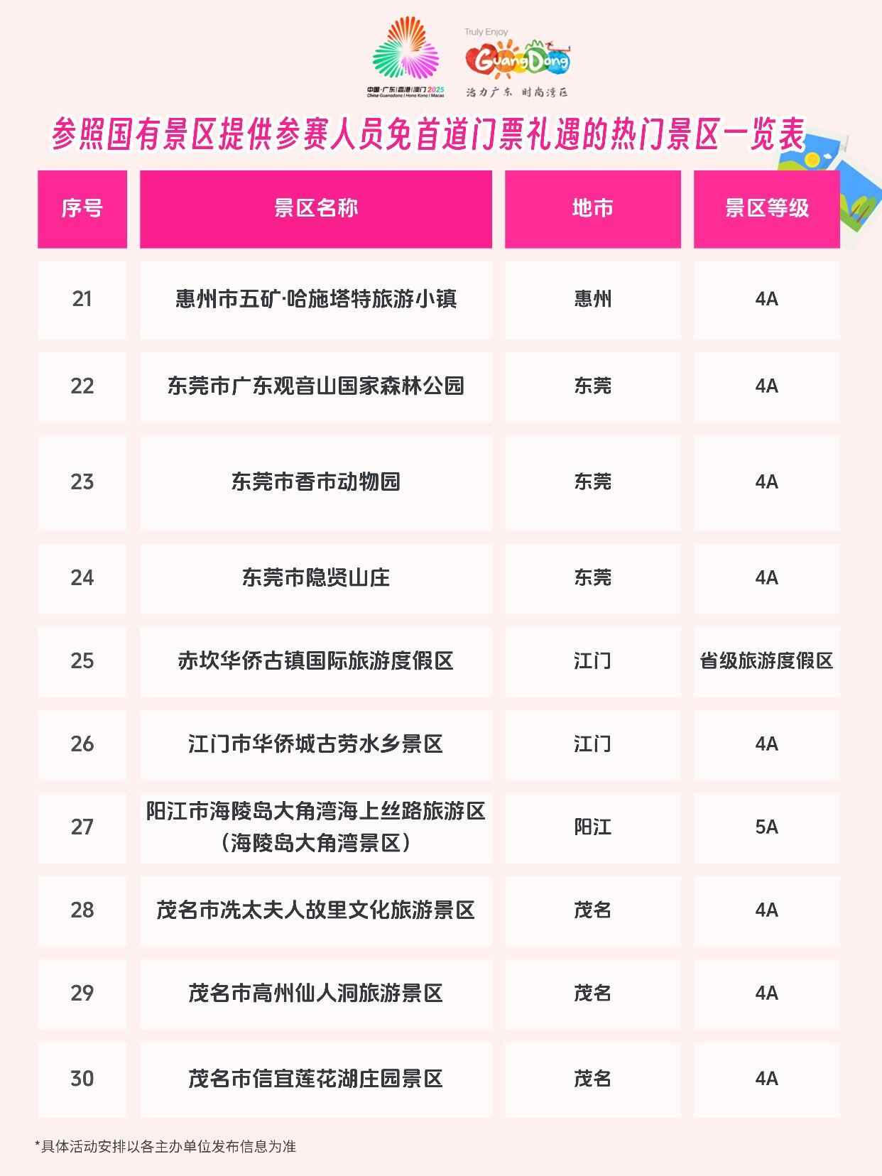 从广州长隆野生动物世界的奇趣探索、融创乐园的欢乐体验,到阳江海陵岛大角湾景区的碧波银滩、江门赤坎华侨古镇的侨乡风情,再到清远连州地下河的溶洞奇观、古龙峡旅游区的飞瀑激流,让参赛健儿在激烈赛事之余,能够漫步岭南山水,品味人文底蕴,在广东留下一段“赛时全力拼搏,赛后自在畅游”的难忘记忆。