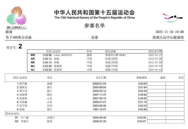 据悉,决赛的8位运动员中,1991年出生已经34岁的孙杨是年龄最大的,最小的陈声鑫2008年出生,比孙杨小了足足17岁。