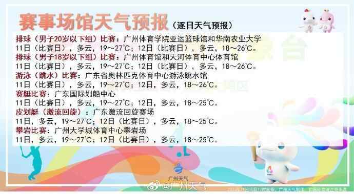 11-12日,东部偏东市县多云转小到中雨局部暴雨,其余市县晴到多云。最低气温:粤北偏北、肇庆和云浮北部市县14~16℃,南部沿海市县19~22℃,其余市县17~19℃。