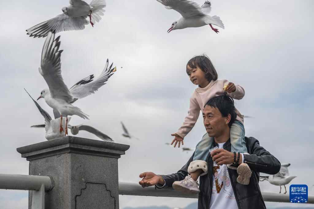 11月10日,游客在云南省昆明市海埂大坝投喂红嘴鸥。