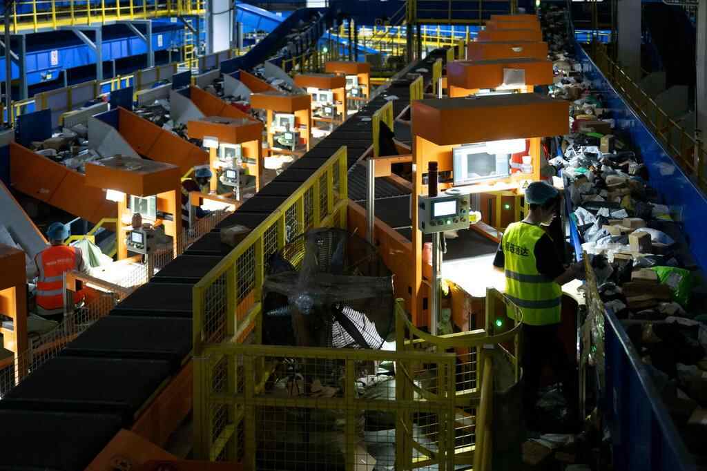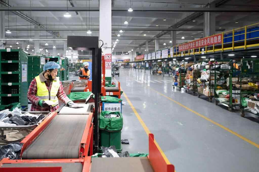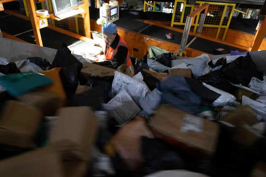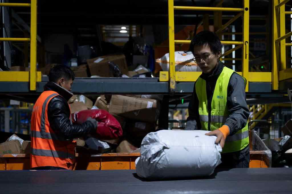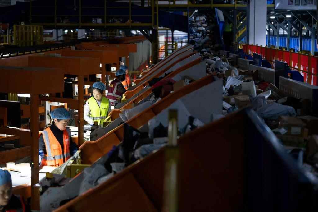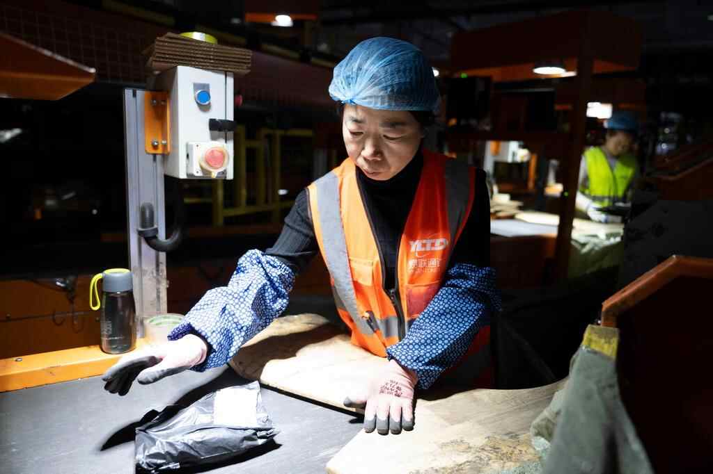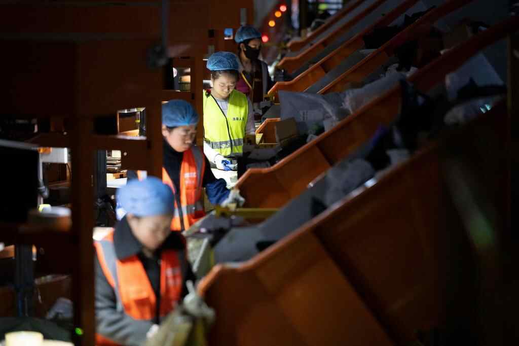 11月10日晚,在中国邮政集团有限公司黑龙江省哈尔滨邮区中心,工作人员在分拣快递。