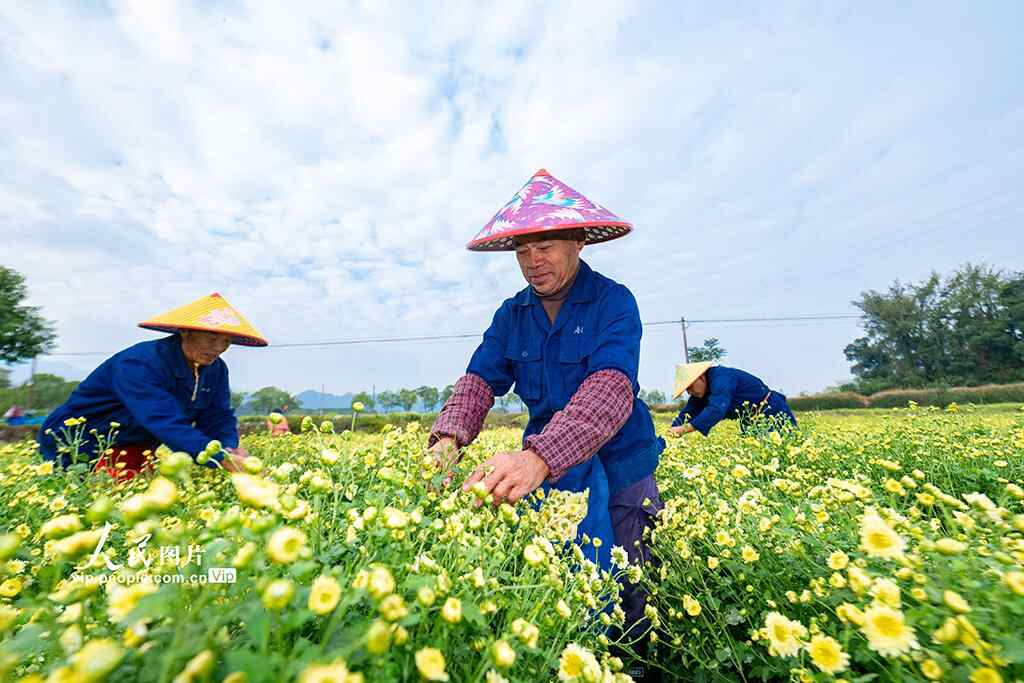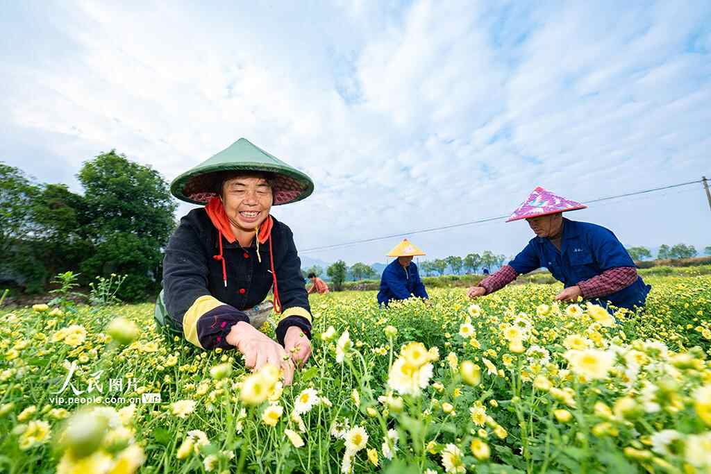 2025年11月10日,浙江省金华市武义县白姆乡金坛村杭白菊种植基地,工人们忙着采收盛开的杭白菊。陈俊摄(人民图片网)