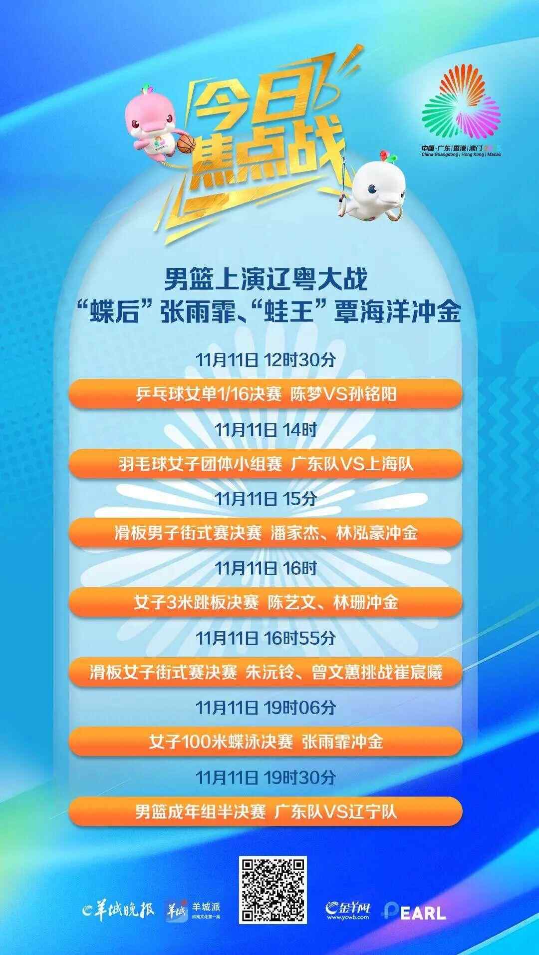 11月11日是十五运会正赛第二个比赛日,在游泳、跳水、举重、赛艇、滑板等项目将产生32枚金牌。