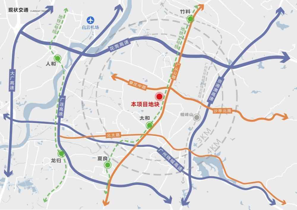 地块坐落于白云区太和镇西北部核心腹地,是区域交通网络的“黄金节点”。周边“两横四纵”道路体系纵横交错,花莞高速、广州绕城高速构筑跨区域高效通勤通道,大广高速、京港澳高速打通南北联动脉络。