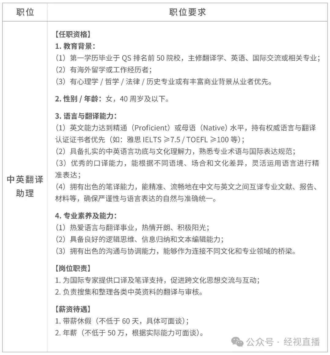 任职资格方面,要求应聘者第一学历毕业于QS排名前50的院校,主修翻译学、英语等相关专业,并拥有海外留学或工作经历。公告还特别指出,具备心理学、哲学、法律、历史专业背景或丰富商业经验的从业者将被优先考虑。在语言能力上,要求英文水平达到精通或母语级别,雅思(IELTS)成绩不低于7.5分或托福(TOEFL)不低于100分者优先。