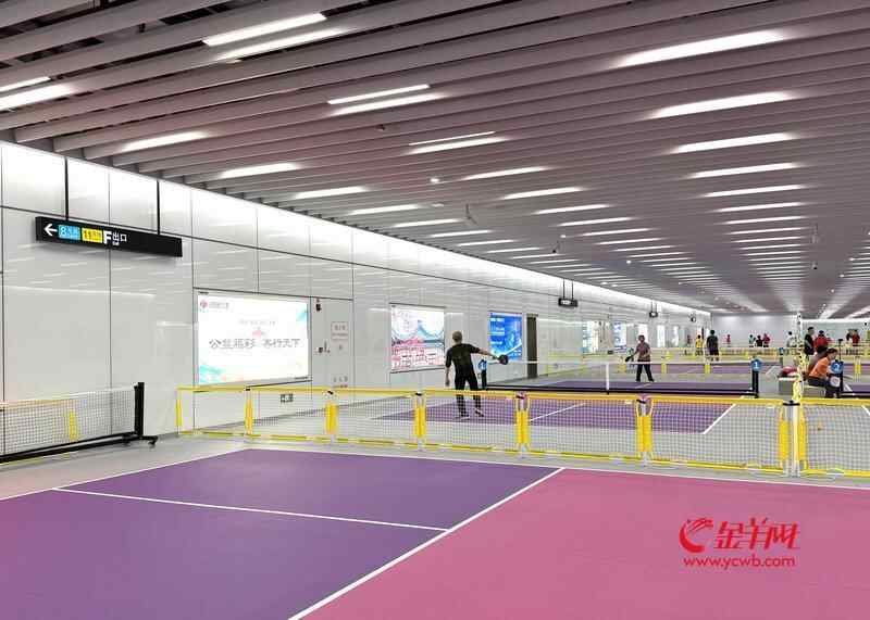11月11日下午,记者来到琶洲地铁站,从十一号线F口出站,从扶梯上到夹层,经过城际琶洲站的安检,“广州地铁匹克球中心”的蓝色标牌十分显眼。