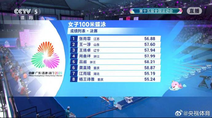11月11日,十五运会女子100米蝶泳决赛,张雨霏游出56秒88,夺得金牌!