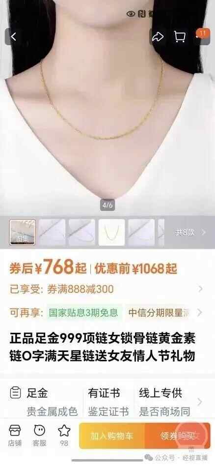 经视直播记者联系许女士,她称今年10月底在淘宝浏览,被“老凤詳1848黄金官营店”促销活动吸引,看中一条0.8克、售价764元的黄金项链。下单前她向商家确认是否为正品足金,商家称是“正品足金999”,收到货项链标注“足金999老凤祥”,她未怀疑。几天后,许女士找到一家线下黄金加工店,“老板帮我检测,发现这条项链是金包银,金的含量不足1%,而银的含量高达90%以上。我当时完全傻了眼。没想到在淘宝上购买的项链竟然是假的。”
