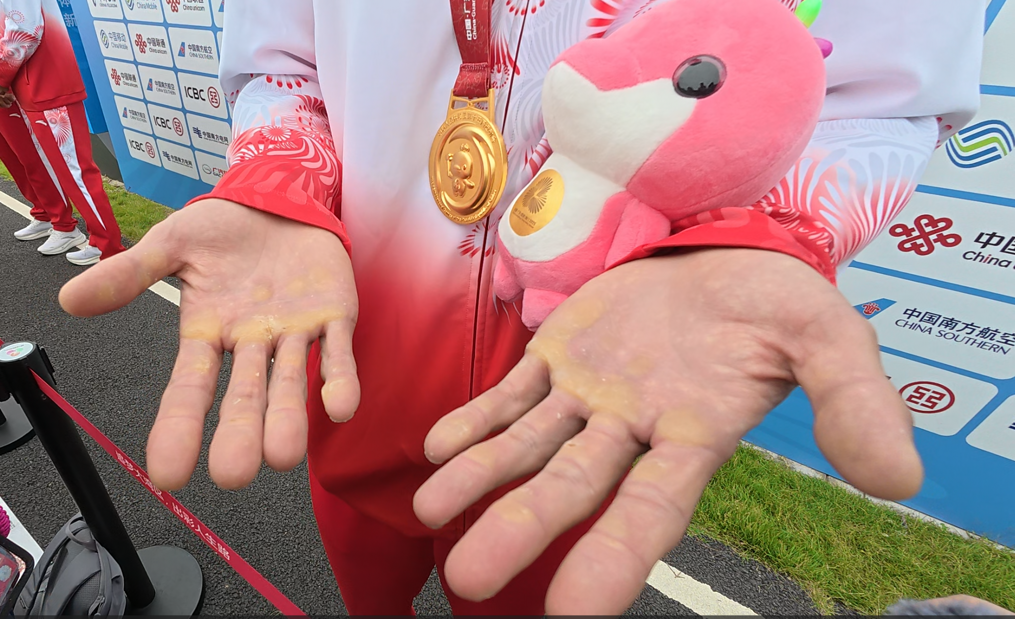 “这块金牌对全队太重要了,一年来的所有付出都是为了此刻”,倪旭林坦言,赛前压力巨大。作为老将,倪旭林的第三届全运会之旅堪称传奇,这是他在该项目上的三连冠。他透露,如果身体条件不允许,这也可能是自己作为运动员参加的最后一届全运会。倪旭林摊开双手,厚厚老茧是常年苦练的印记,“从2011年开始,训练磨出的老茧要定期用刀削掉,不然会影响握桨发力”。谈及未来,这位亚运会冠军表示将根据身体恢复情况决定是否继续征战。倪旭林和搭档聂毅德搭档近5年,两人从2021年起都从单桨转到双桨,倪旭林说,“单转双难度不小,需要两个人都做好身心的双重配合。”