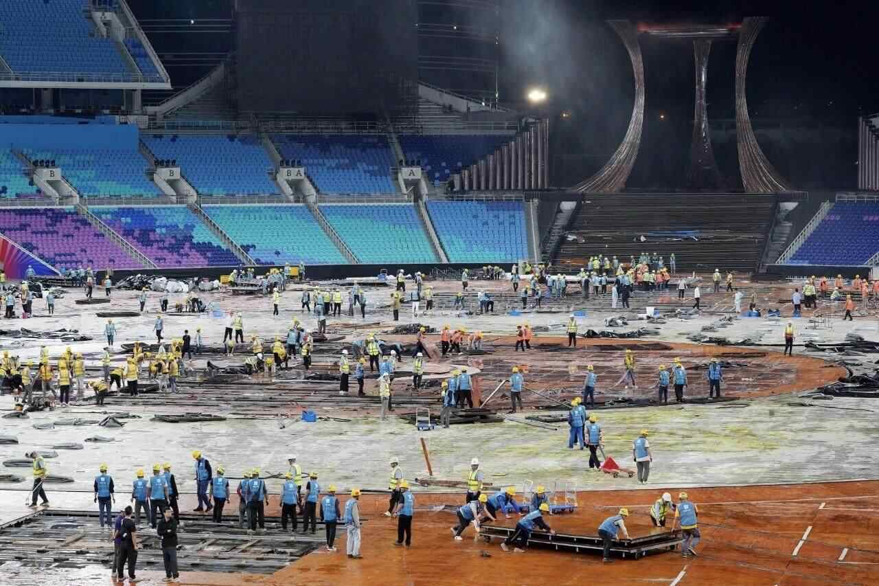 虽然工作量巨大,但转场进度大幅超前。开幕式结束后即启动了转场工作,11月10日5时,现场完成场芯贵重设备拆除,11时完成全部舞台清运,16时启动足球场首片草皮铺设,11日5时草皮铺设完成,转换工作总历时近30个小时。