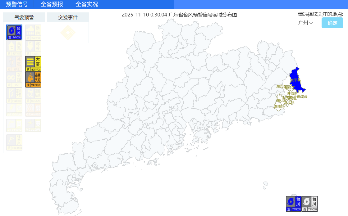 截至9日22时36分,广东局地已经发布台风预警信号,其中汕头全市发布台风白色预警信号,潮州饶平发布台风蓝色预警信号。