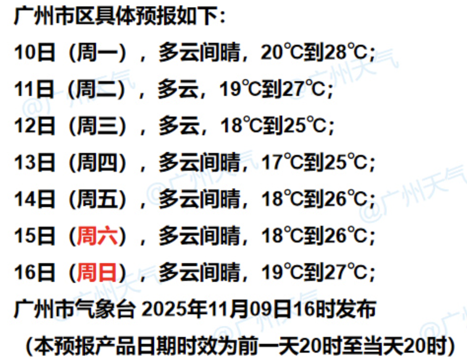 另据广州市气象台预计,未来一周广州天气总体平稳,气温小幅波动,其中10日至13日受到弱冷空气和台风外围环流影响,广州风力有所加大,体感温度略凉。