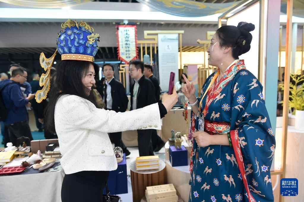 11月6日,参观者(左)在第八届进博会人文交流展区的湖北展厅试戴一顶凤冠。
