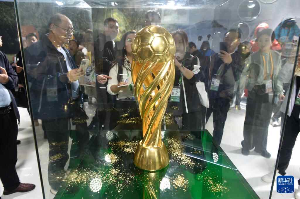 11月6日,观众在第八届进博会江苏展厅参观拍摄2025年“苏超”冠军奖杯。