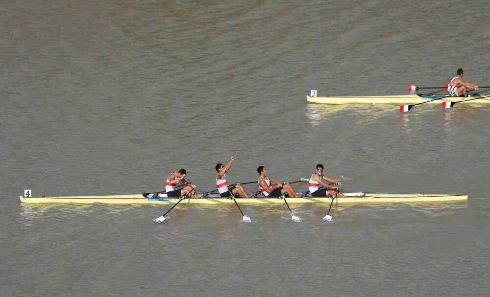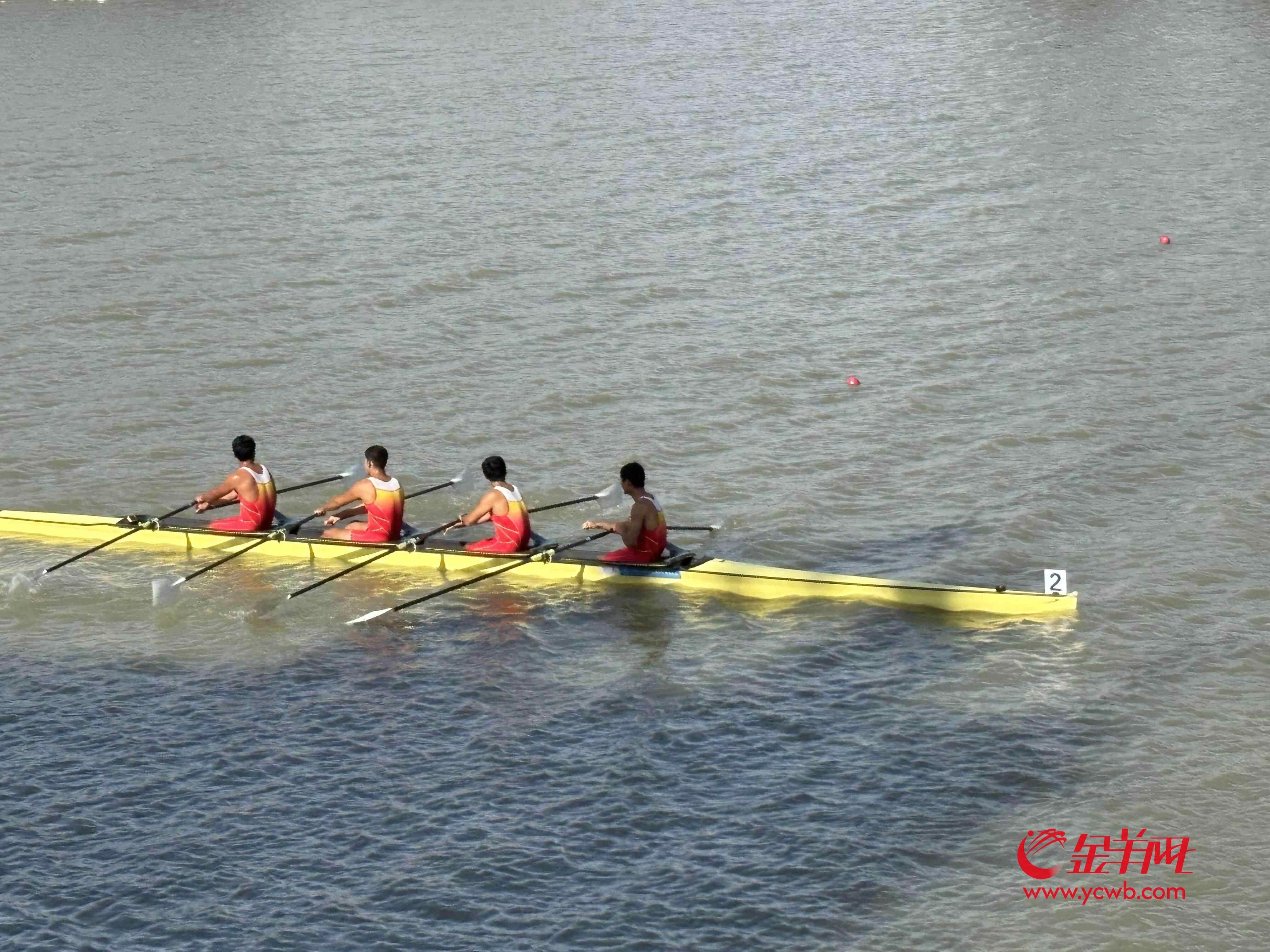 10日上午,十五运会开幕后的首金在位于广州钟落潭的广东国际划船中心的赛艇赛场诞生。在率先进行的男子四人双桨决赛中,江苏队以4分12秒24力压广东队夺得冠军,广东队以4分13秒78获得亚军,个人队获得第三名。