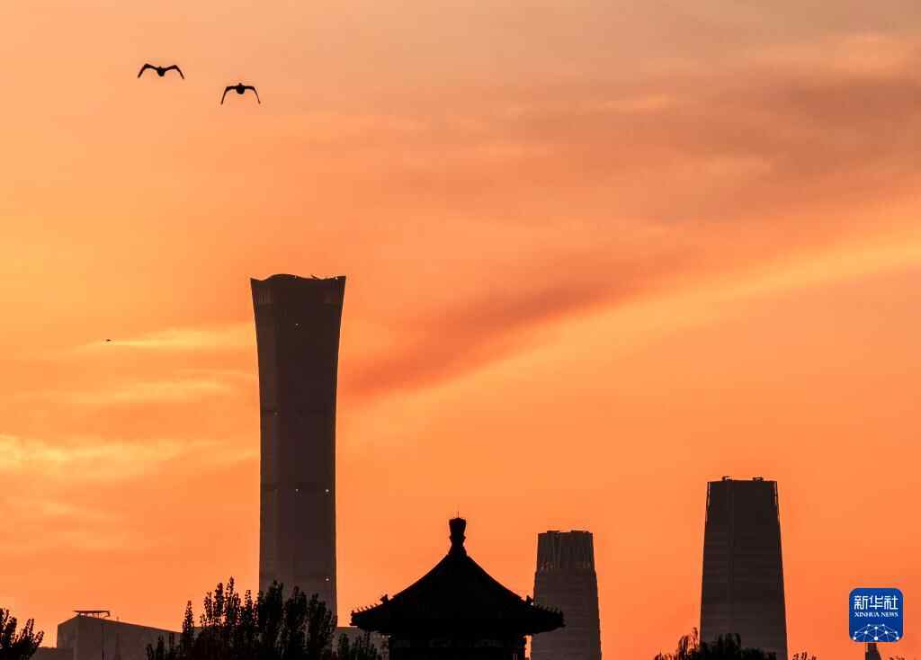 11月10日清晨,北京上空晨曦微露,霞光满天。中国尊、望海楼等地标建筑在晨光中与什刹海光影交错。