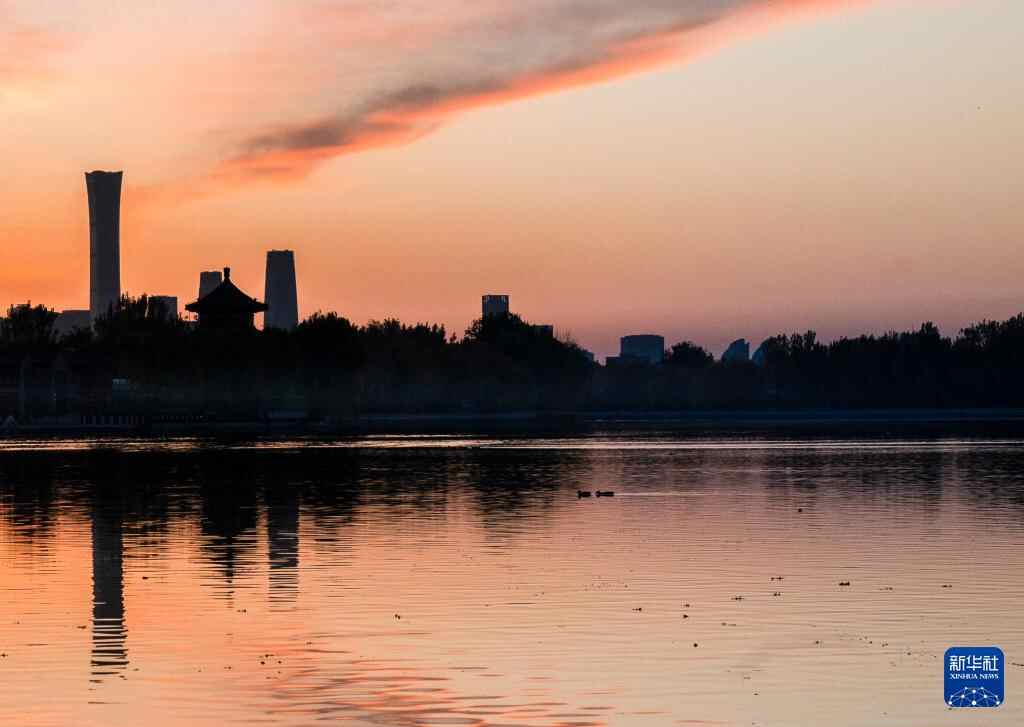 11月10日清晨,北京上空晨曦微露,霞光满天。中国尊、望海楼等地标建筑在晨光中与什刹海光影交错。