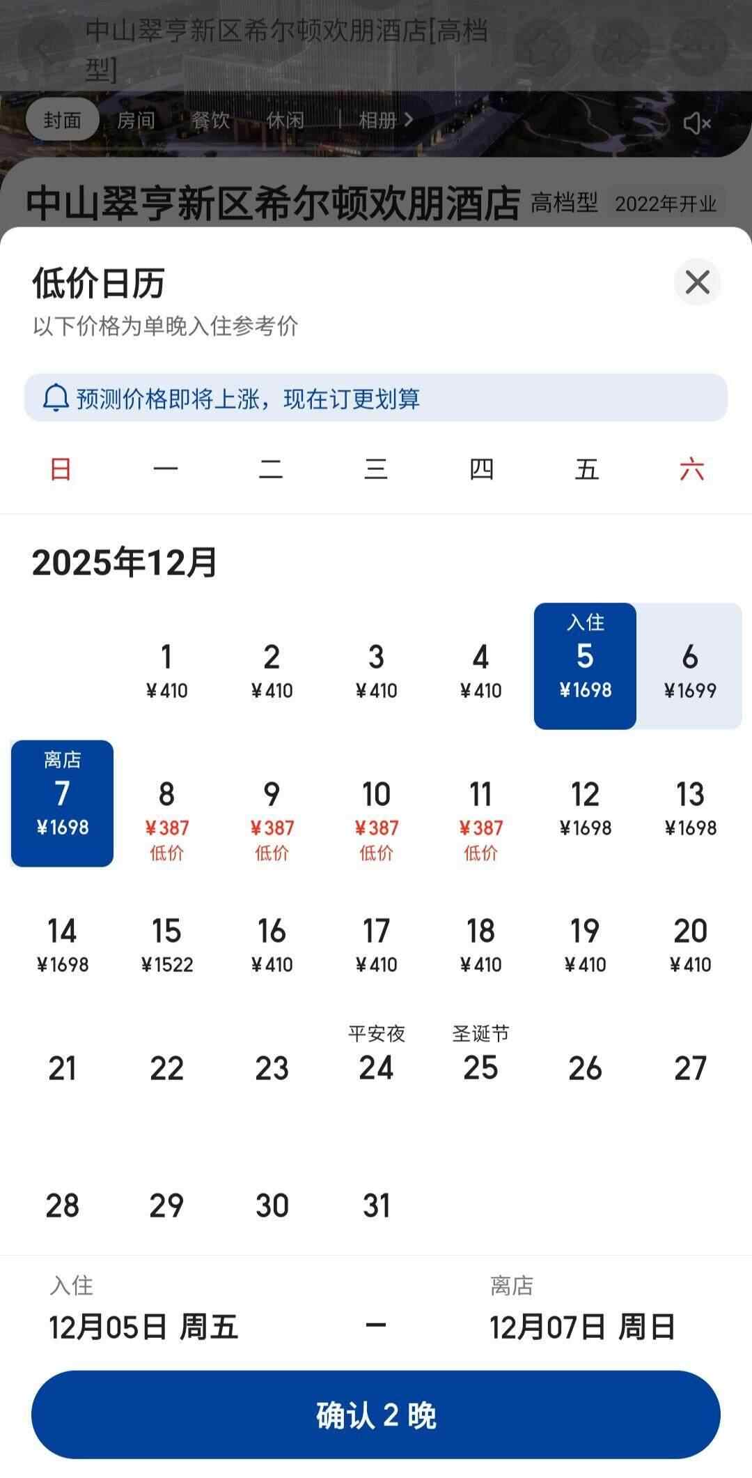 由于场馆距离广州市区较远,记者查询美团平台发现,场馆附近的多家酒店已经大幅涨价。以临近深中通道的中山市翠亨新区为例,位于翠亨新区的希尔顿欢朋酒店在12月5日至15日的两个周末价格已经涨至每晚最低1698元,而该酒店平日价格在400元左右,涨幅超4倍。