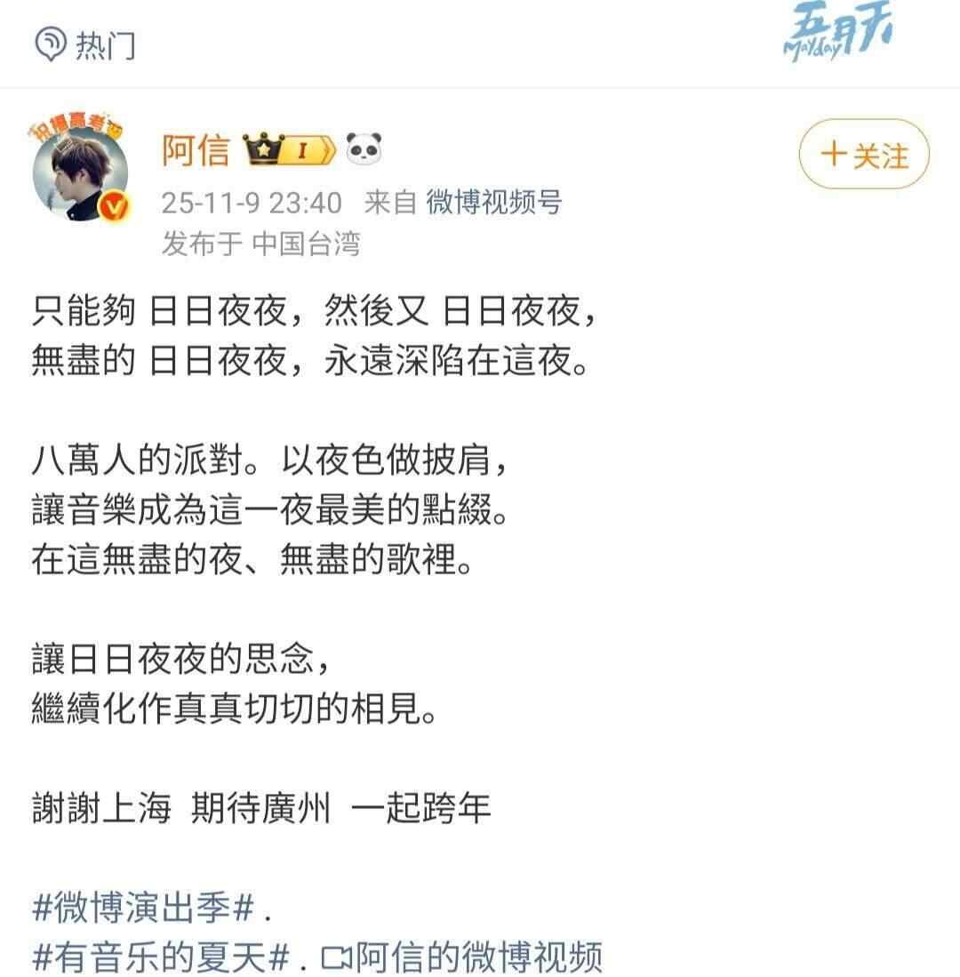 11月9日晚,五月天主唱阿信发布微博,文中写道:“期待广州,一起跨年”。