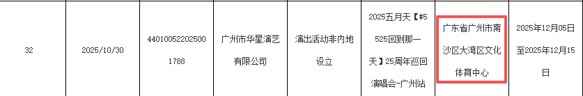 据广州市文化广电旅游局官网公布的营业性演出审批信息,“2025五月天‘#5525回到那一天’25周年巡回演唱会广州站”已通过审批,演出时间为2025年12月5日至12月15日期间,地点为南沙区大湾区文化体育中心。
