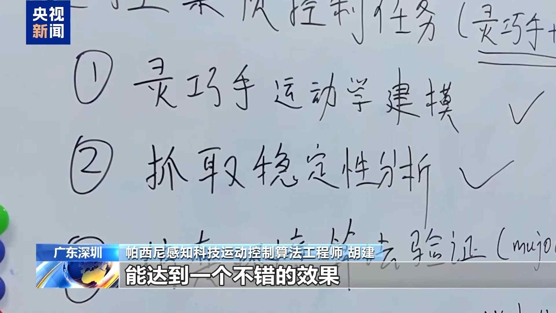 帕西尼感知科技运动控制算法工程师 胡建:我们要对它抓取物体的稳定性分析,感知到的数据,通过我们的模型去建模,才能做到应对更复杂的场景。之前定的任务是把这一黑板的任务目标擦干净,下面这些工作可能比前面的四步加起来时间还要长,但是我们有信心在两个月之内能达到一个不错的效果。