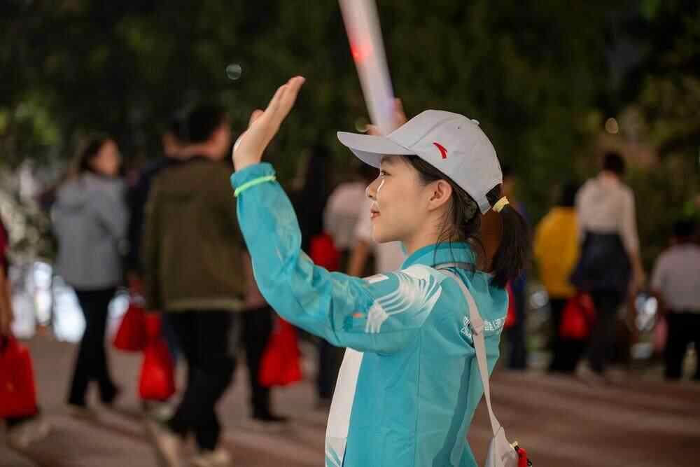 夜幕降临,在由广东奥林匹克体育场到广东奥林匹克体育中心射箭场这条蜿蜒近1公里的步道旁,志愿者们分立步道两边,手持荧光棒送别观众。