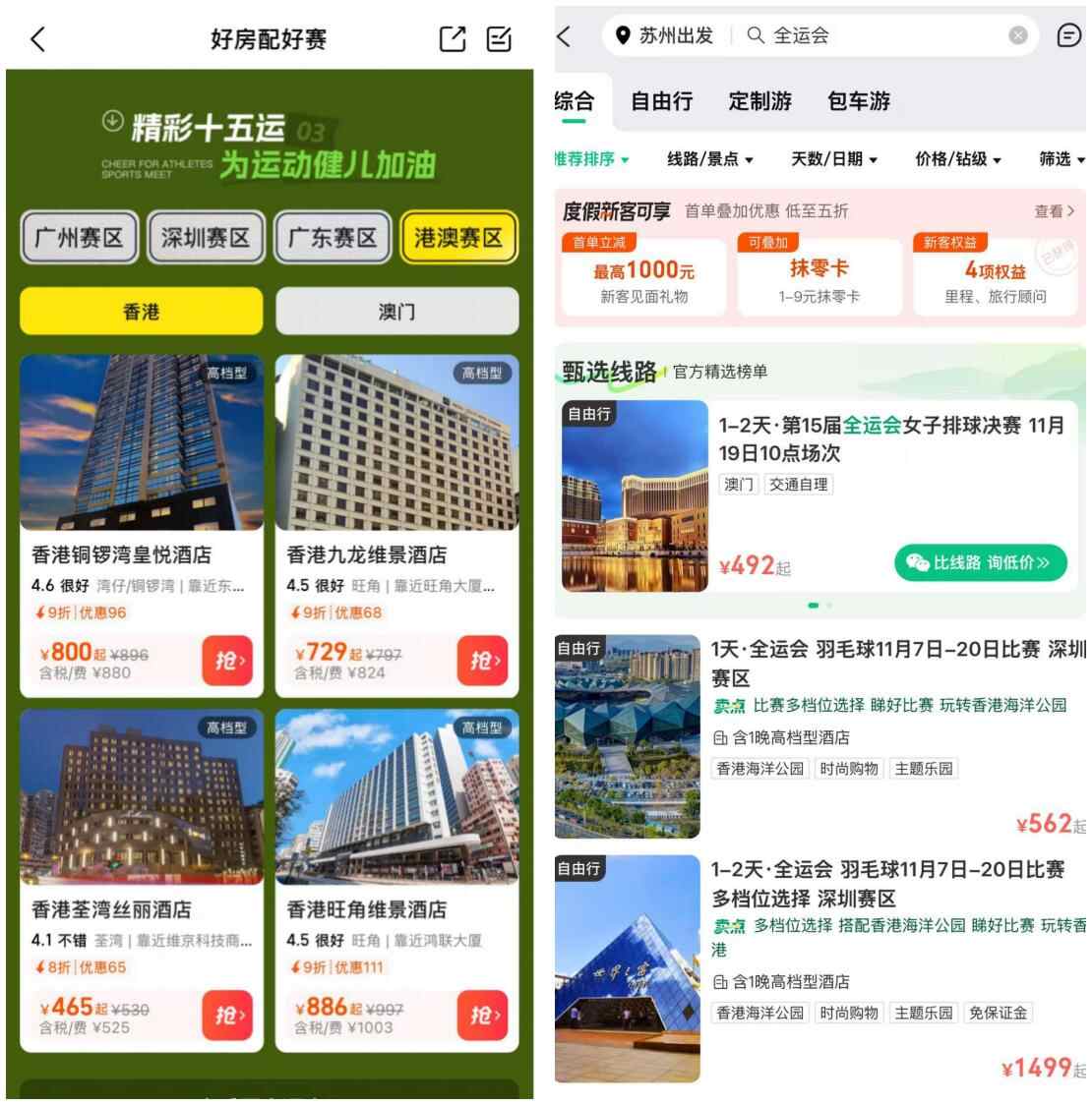 同程旅行上线“好房配好赛”酒店专题活动页,覆盖广东及港澳赛区,部分赛场周边酒店优惠低至4折起。同时推出搜索“全运会”即可选购的观赛套餐,将住宿、景点与紧俏的赛场门票打包,为游客提供一站式方案。