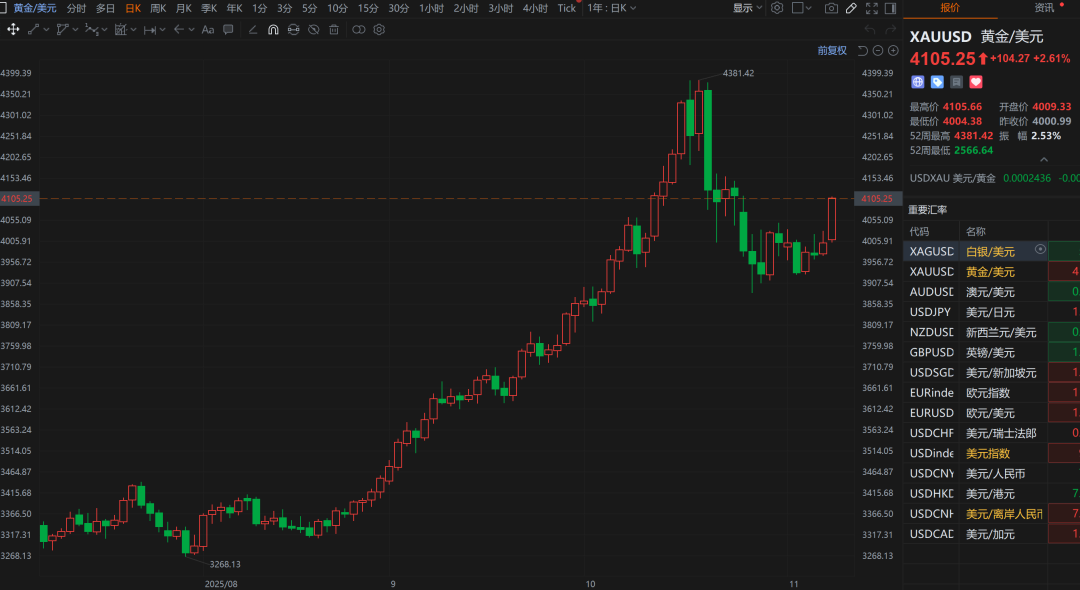 截至今日晚间发稿,现货黄金向上突破4100美元/盎司,为10月27日以来首次,日内涨超2.6%。