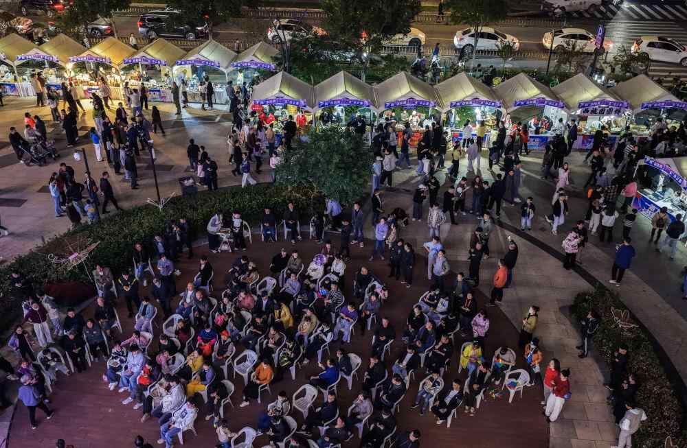 11月7日,依托当晚在西施篮球中心举办的系列演唱会,“陶你所需·朱市云集”社区共富市集吸引了大批市民游客(无人机照片)。新华社记者 徐昱 摄