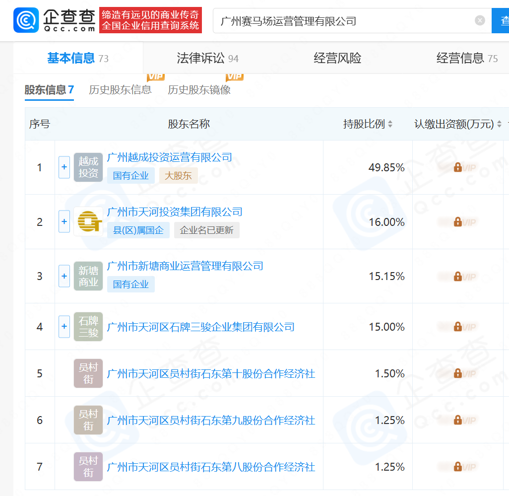 各股东持股比例如何?查阅企查查可见,广州赛马场运营管理有限公司共由7个股东组成(至2025年11月17日),详见下图: