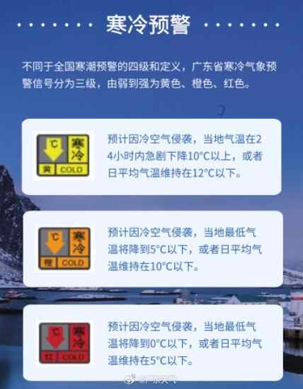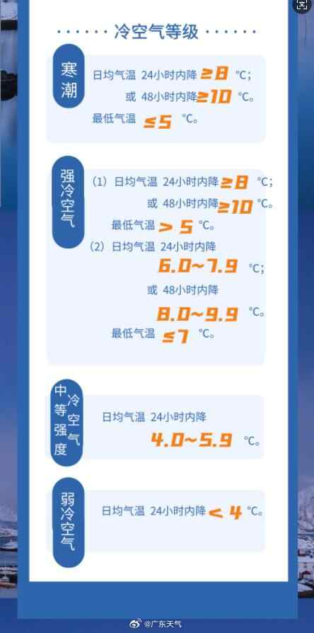 根据强弱程度,广东将冷空气分为四个等级:寒潮>强冷空气>中等强度冷空气>弱冷空气。