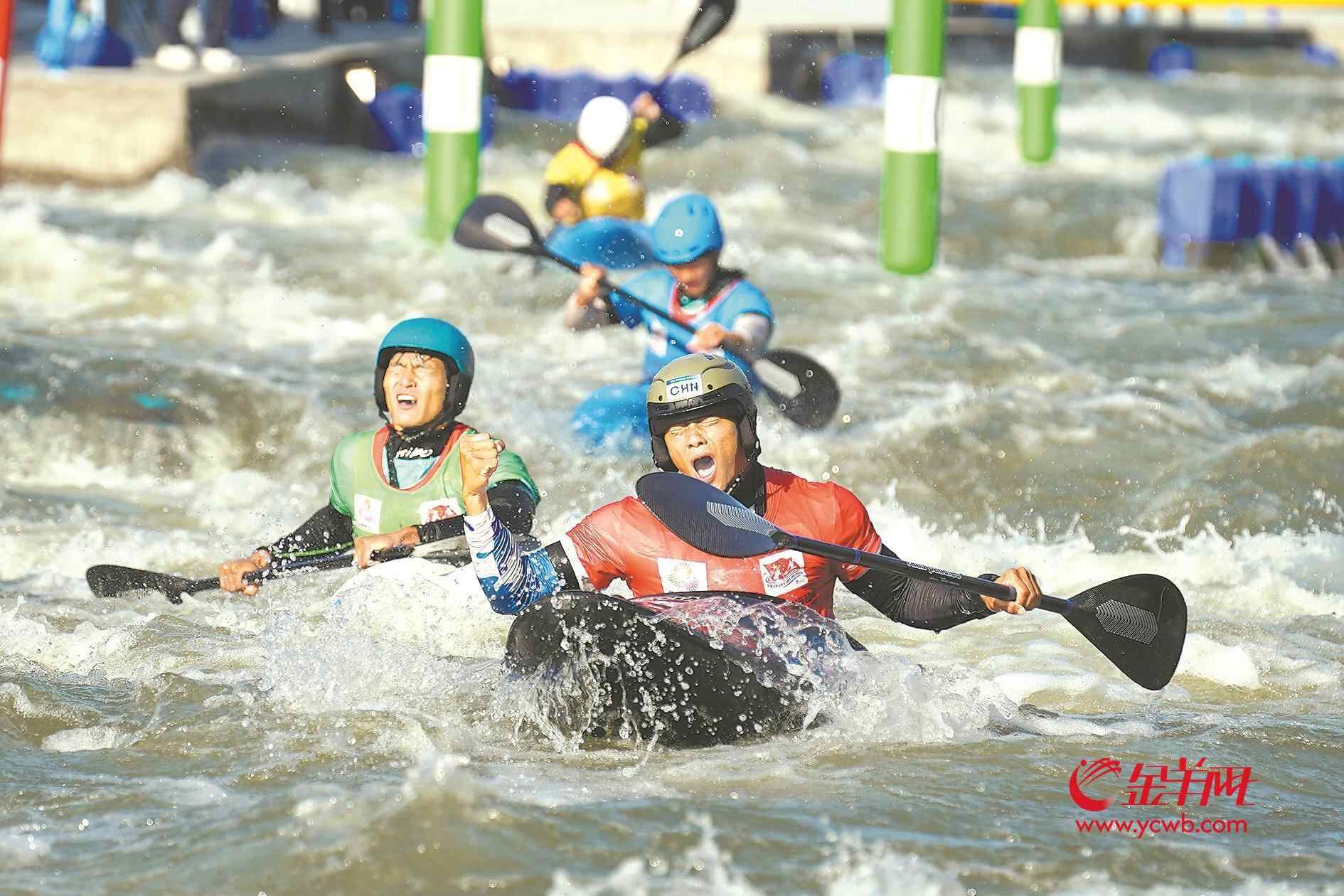 男子极限皮艇决赛中,广东选手胡兆山率先冲出,全运会男子单人皮艇“三冠王”全鑫紧随其后。行至翻滚障碍区时,胡兆山完成了360度空中转体后依然保持领先,全鑫则继续冷静追击。此后,胡兆山过闸时出现了路线间隙,经验老到的全鑫抓住机会切入另一个航道完成反超,并保持优势直至终点。