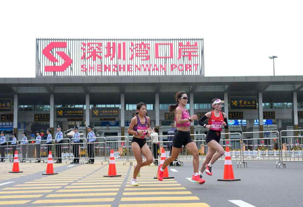 11月15日,第十五届全国运动会田径项目女子马拉松比赛参赛选手经过深圳湾口岸。新华社记者 丁增尼达 摄