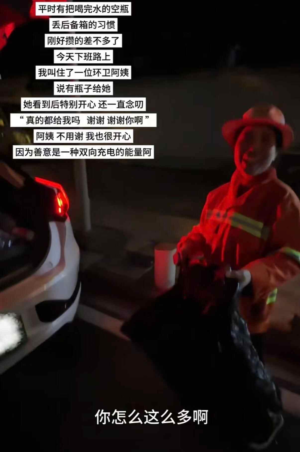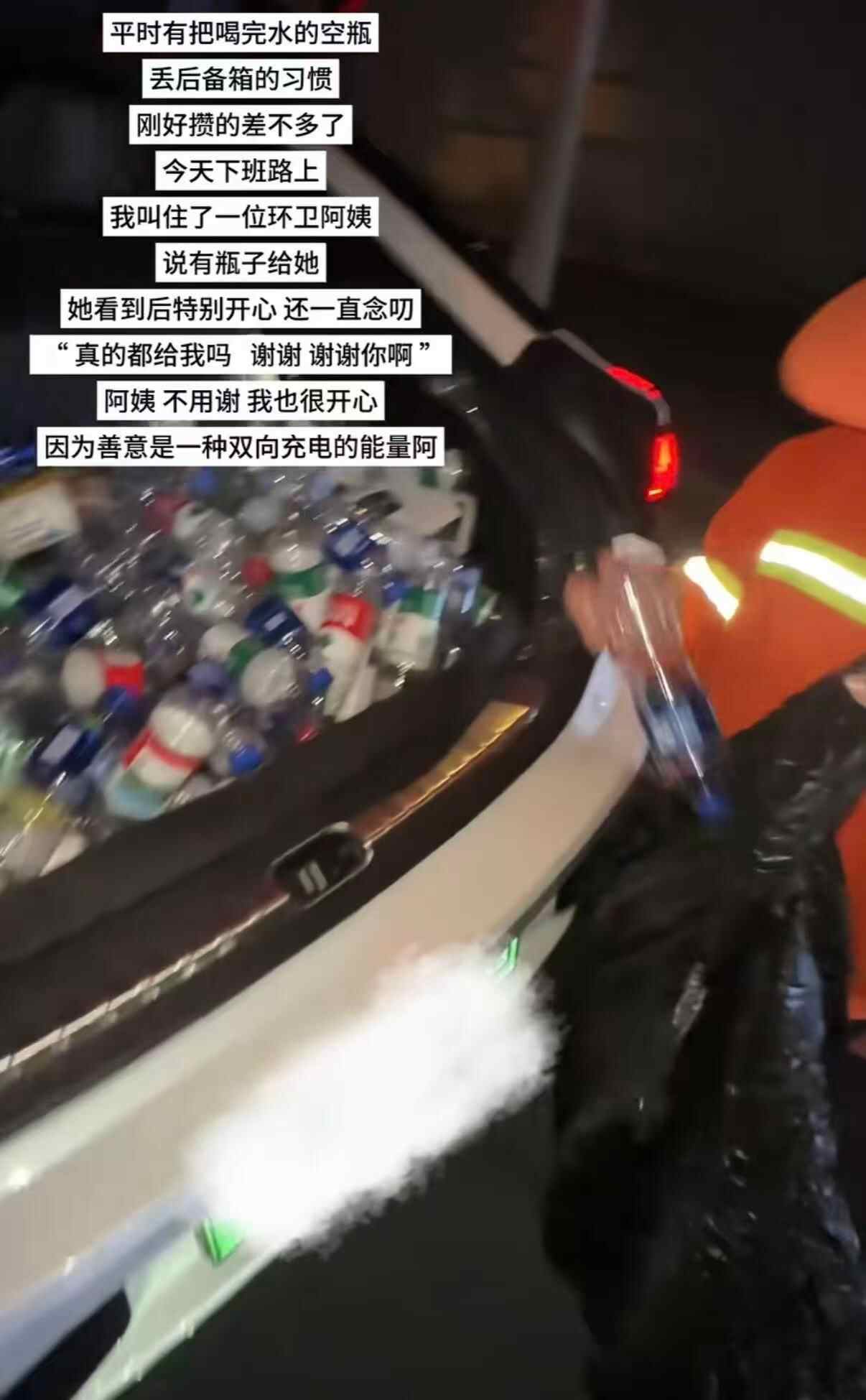 该市民表示,平时有把喝完水的空瓶丢后备箱的习惯,刚好攒得差不多了,下班路上便叫住一位环卫阿姨,说有瓶子给她。